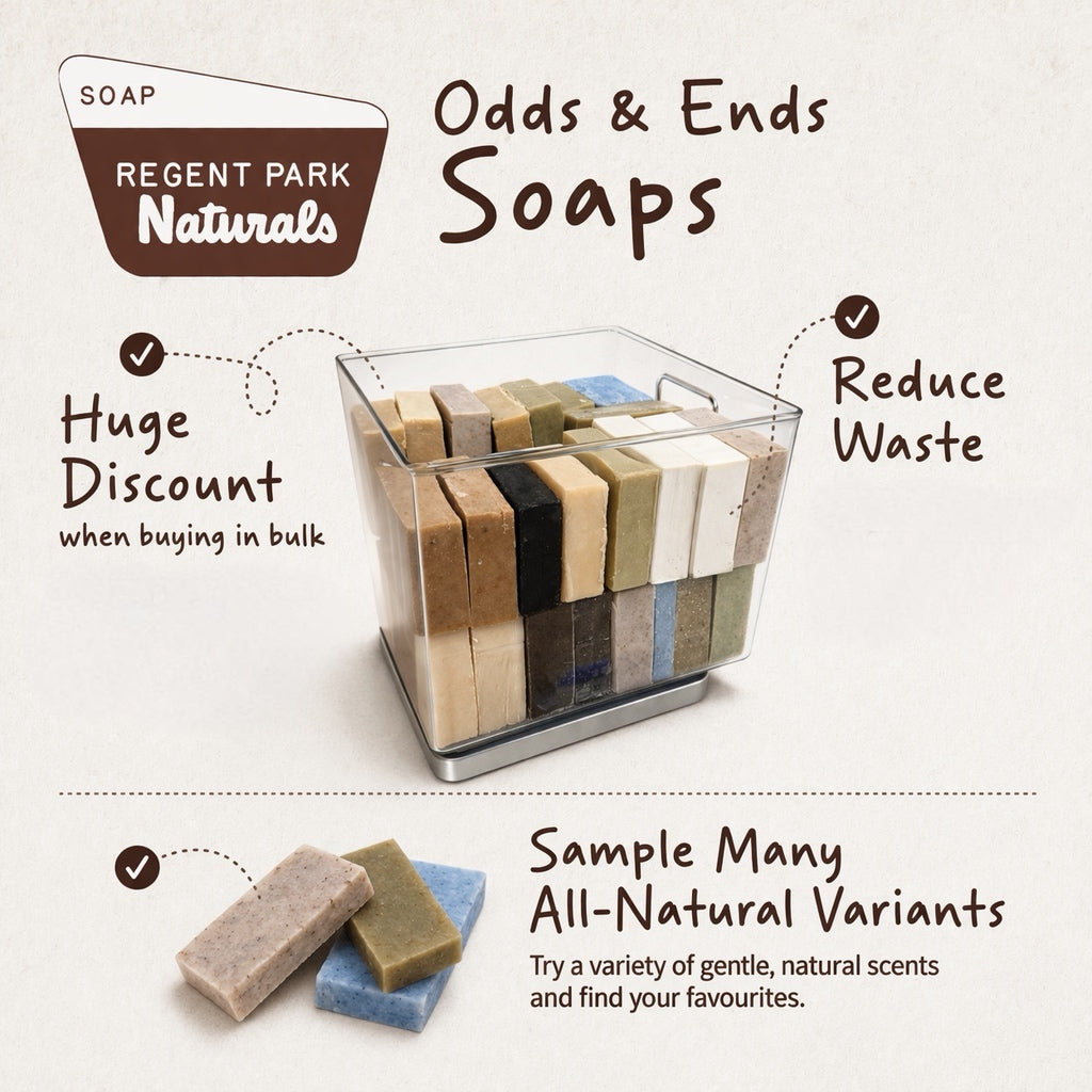 Unravel the mystery behind every batch as you savor the beauty and benefits of these assorted soap remnants. Join us on a journey that celebrates eco-consciousness, handcrafted excellence, and the joy of embracing life's little imperfections. Welcome the unexpected and elevate your bathing ritual with the finest selection of handmade soap odds and ends - a true testament to both nature's ingenuity and Regent Park Naturals' commitment to crafting exceptional unwrapped natural products.