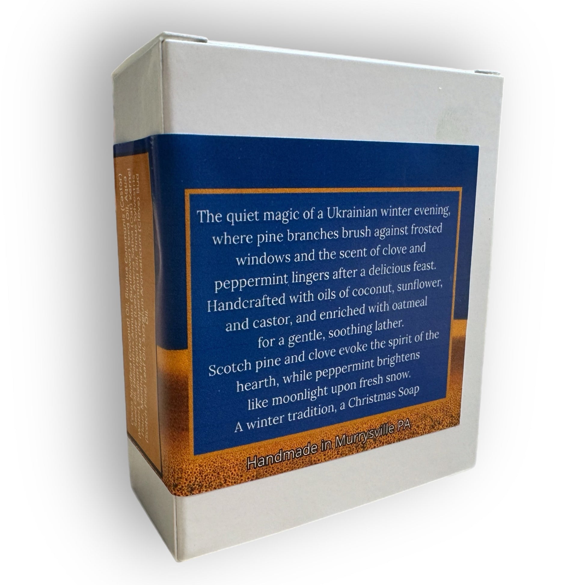 Capture the spirit of a Ukrainian winter celebration with this artisan soap inspired by family gatherings, candlelight, and the crisp scent of pine after a holiday feast.